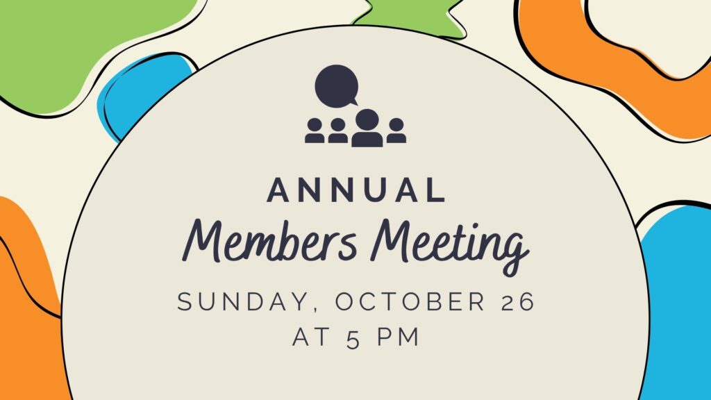 Everyone is invited to our Annual Members Meeting on Sunday, October 26th at 5 PM. Snacks will be available starting at 4:15pm. All are encouraged to attend (member or not) for important ministry updates.