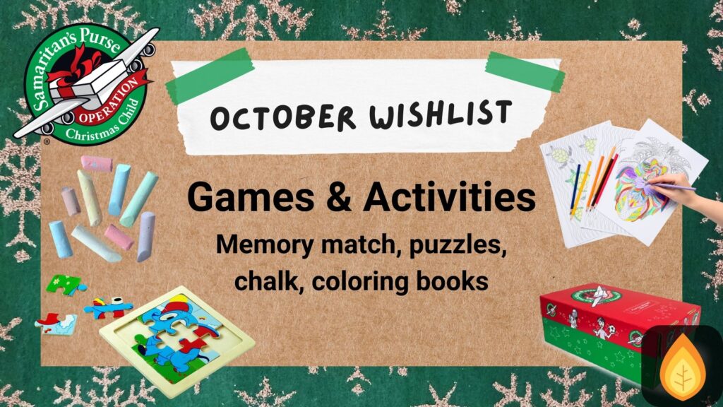 In October, we are collecting games and activities. This includes things like memory match, puzzles, chalk, and coloring books.