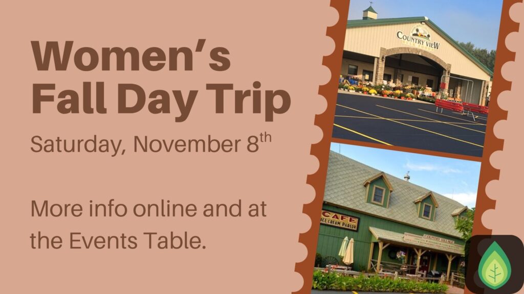 Meet at Mayfair Bible Church to leave at 9:30 am. We’ll drive to Country View Bulk Food Store in Snover, Michigan (about 1.5 hours away) to shop and have lunch. Then we’ll go to Pride and Country Village near Saginaw and make our way home by about 4:30 pm.