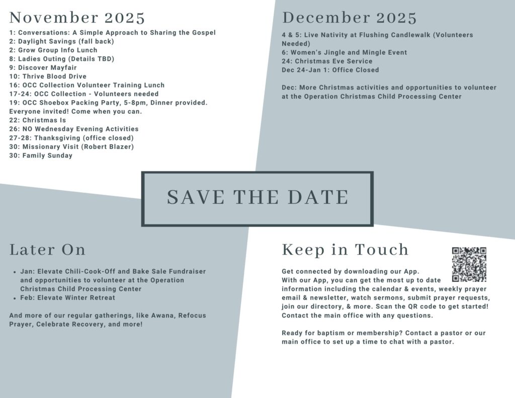 Vacation Bible School 2026 will be the week of July 20 through 24. The theme will be announced in early 2026. Please add this to your calendar.