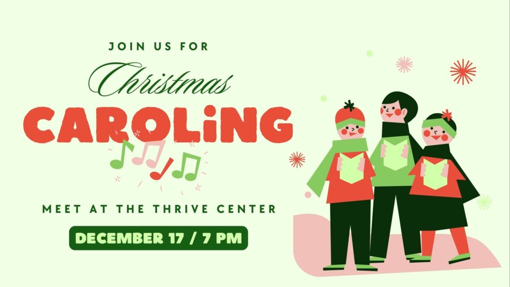 All are invited to join us for Christmas caroling on Wednesday, December 17 at 7pm. We’ll meet at the Thrive Center, carol in the neighborhood that connects to the Thrive Center, then end with hot chocolate and treats before heading home.