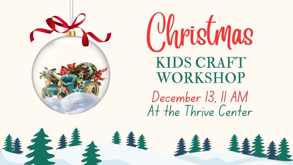Kids are invited to a free craft workshop on Saturday, December 13 at 11am. Miss Ruby will have some fun crafts and a Christmas story at the Thrive Center. Invite your friends and family. Please RSVP.