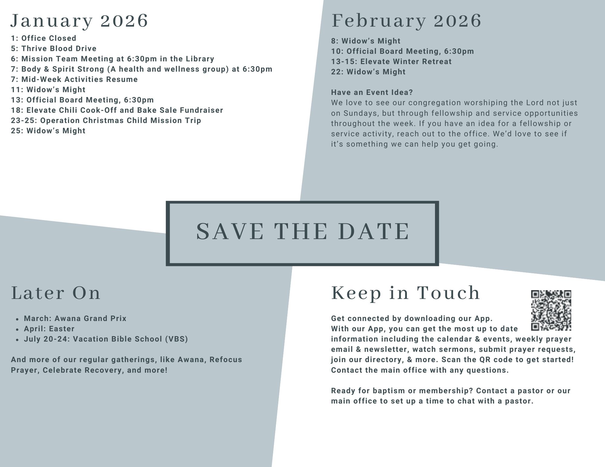 Vacation Bible School 2026 will be the week of July 20 through 24. The theme will be announced in early 2026. Please add this to your calendar.